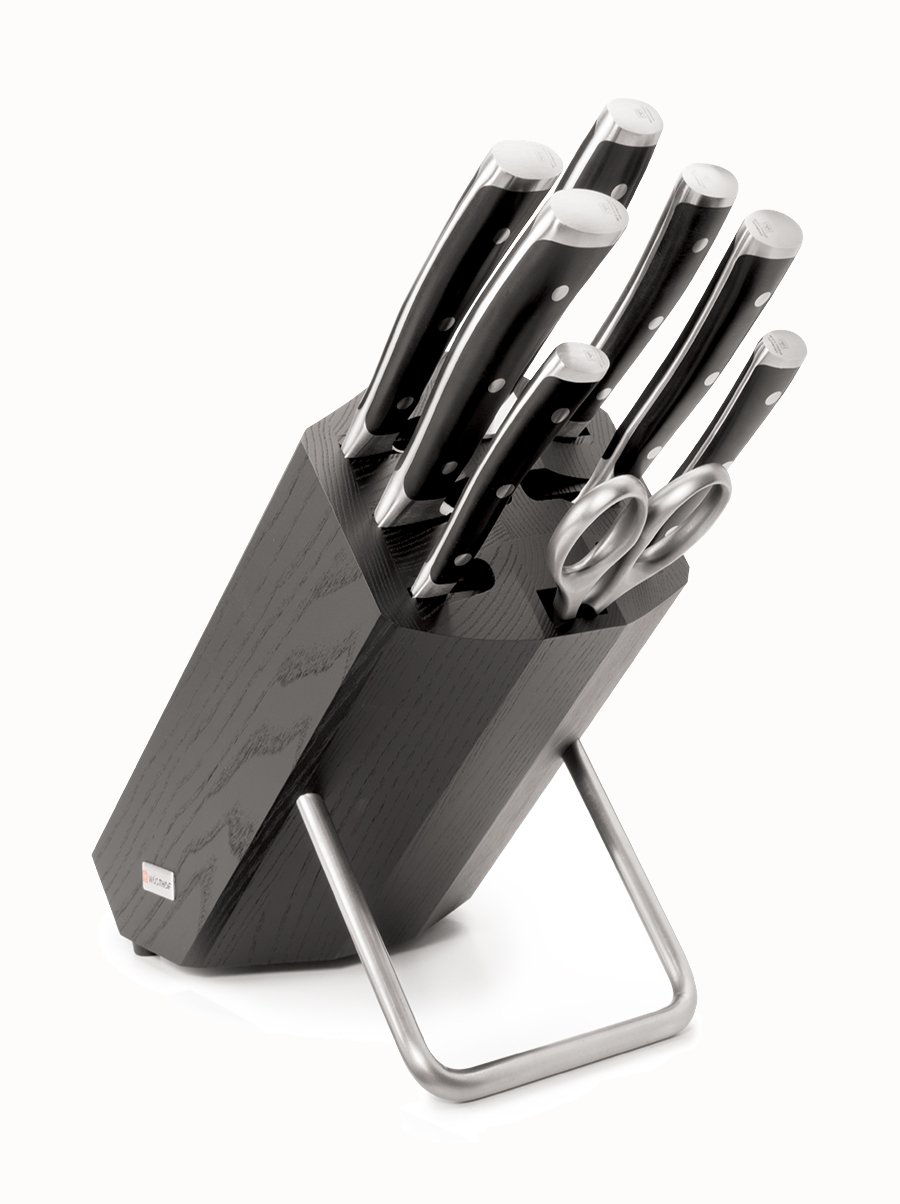 Το μπλοκ μαχαιριών Wusthof Classic Ikon είναι ένας ασφαλής αποθηκευτικός χώρος. Όποτε χρειάζεστε ένα μαχαίρι, έχετε πάντα ένα προσιτό. Το πρακτικό αυτό μπλοκ μαχαιριών παρέχει προστασία στις λεπίδες σας καθώς επίσης και μια οπτική ανάταση στο ντεκόρ της κουζίνας σας. Φτιαγμένο από επιλεγμένο κομμάτι οξιάς σε μαύρο χρώμα. Περιλαμβάνει: 4086-9 Μαχαίρι γενικής χρήσης 9 εκ. 4126-14 Μαχαίρι γενικής χρήσης 14 εκ. 4506-16 Μαχαίρι carving 16 εκ. 4166-23  Μαχαίρι ψωμιού 23 εκ. 4176-17  Μαχαίρι Santoku 17 εκ. 4596-20 Μαχαίρι Chef - λαχανικών 20 εκ. 4468-26 Μασάτι 26 εκ. 5553 Ψαλίδι inox
