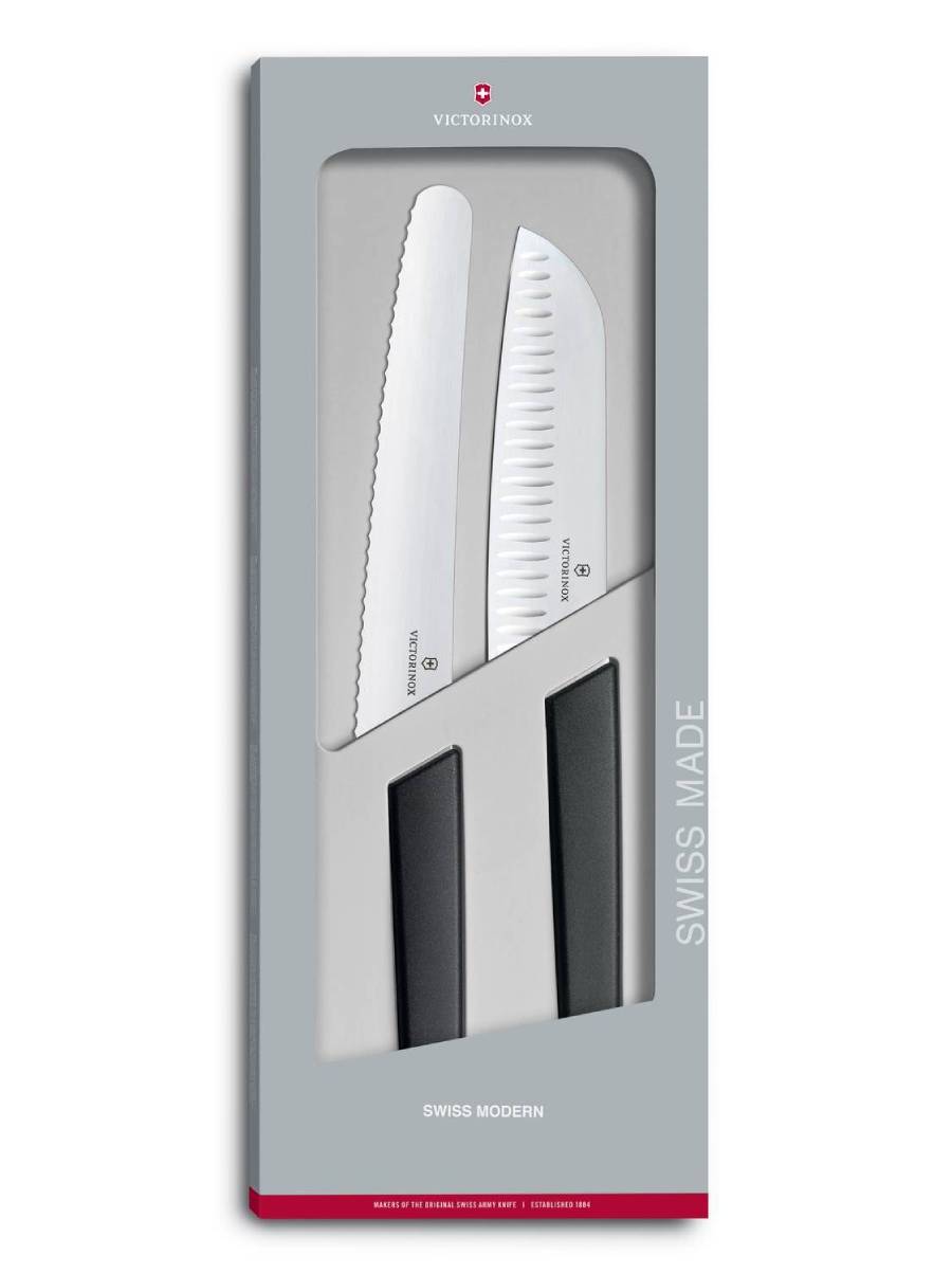 Το σετ Victorinox Swiss Modern περιλαμβάνει: Μαχαίρι Santoku 17 εκ. Μαχαίρι Ψωμιού 22 εκ. Η Swiss Modern είναι μία σειρά σχεδιασμένη για άνετο μαγείρεμα, γεγονός που την κάνει να αποτελεί μία από τις καλύτερες σειρές για τον ερασιτέχνη μάγειρα που θέλει το καλύτερο για το μαγείρεμα στο σπίτι!